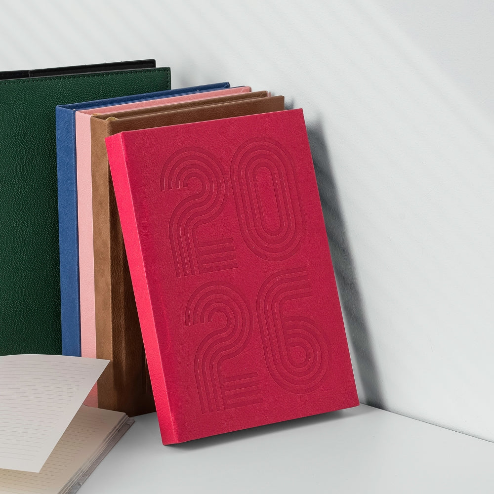 Ši darbo knyga su sodria vyšnine eko odos tekstūra – tai pareiškimas apie tave: kūrybingą, ryžtingą ir nebijančią(-į) spalvų. Stilingai įspausti 2026 skaičiai per visą viršelį kuria retro dvasią su moderniu charakteriu. Joje – ne tik vieta planams, bet ir impulsas veikti su polėkiu.