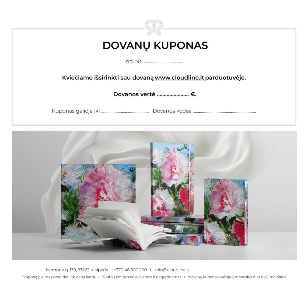 Dovanokite geriausias emocijas! *Dovaną išsirinkite svetainėje www.cloudline.lt *Ant kupono nurodomas specialus nuolaidos kodas, kurį galima bus panaudoti apsiperkant *Kuponą galima panaudoti tik vieną kartą *Kuponas į pinigus nekeičiamas ir negrąžinamas *Kuponas galioja 6 mėnesius nuo įsigijimo datos *Elektroninis kupono variantas išsiunčiamas gavus Jūsų mokėjimą ir apdorojus užsakymą (siunčiama darbo dienomis 8-17 val. Jūsų nurodytu el. paštu) *Jei tarp pasirinkimų nėra norimos sumos, susisiekite el. paštu info@cloudline.lt